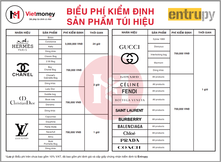 Khách hàng khi đến với VietMoney có thể kiểm định và cầm các loại túi xách thuộc những thương hiệu sau: Hermès, Chanel, Dior, Louis Vuitton, Gucci, Goyard, Celine, Fendi, Bottega Veneta, Saint Laurent, Burberry, Balenciaga, Chloé, Prada và Coach.