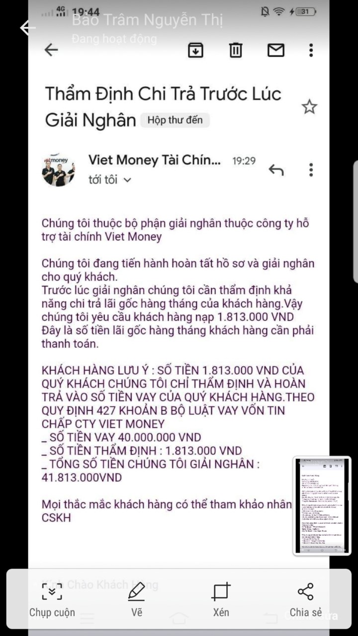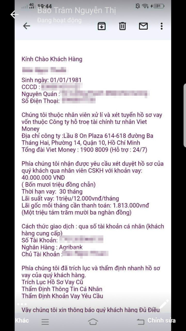 Sau đó, khách hàng liên tục bị bạn nhân viên này yêu cầu đóng thêm nhiều khoản phí mà hồ sơ vay thì vẫn không thấy tiến triển gì. Thấy vậy Khách mới gọi điện lên số Hotline 19008009 của VietMoney để kiểm tra tình hình hồ sơ. Sau đó mới phát hiện là mình bị lừa đảo.