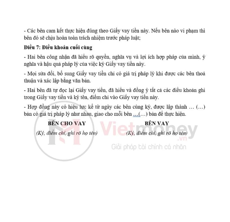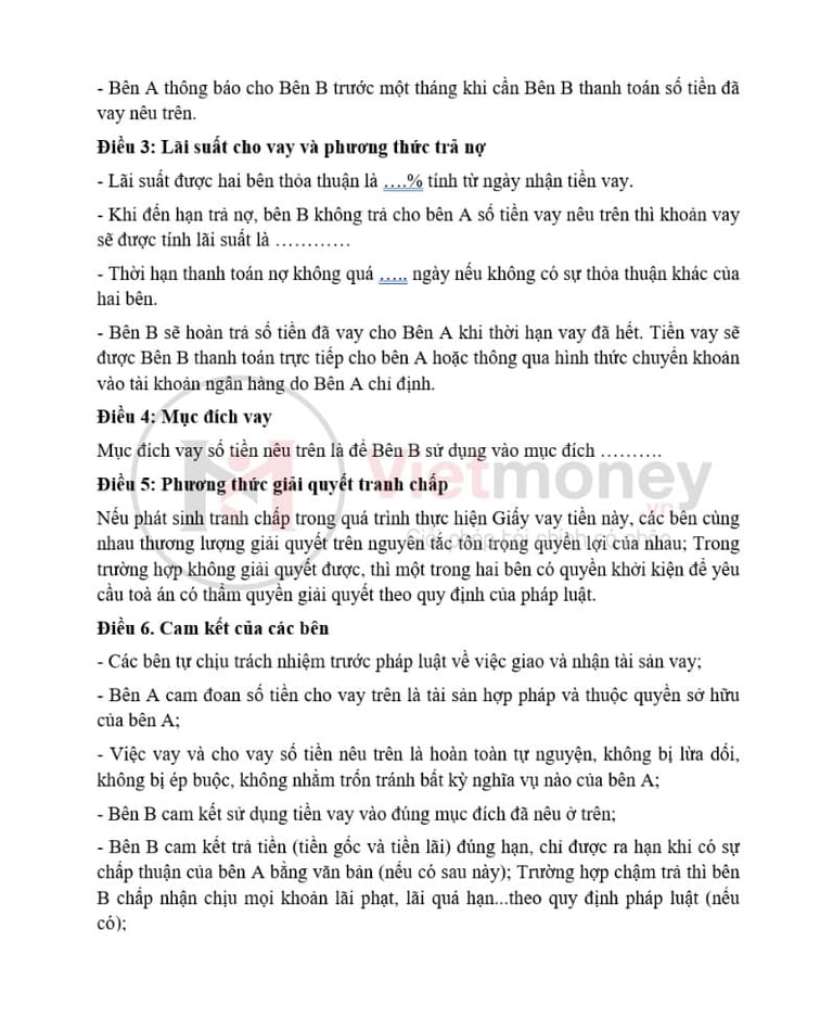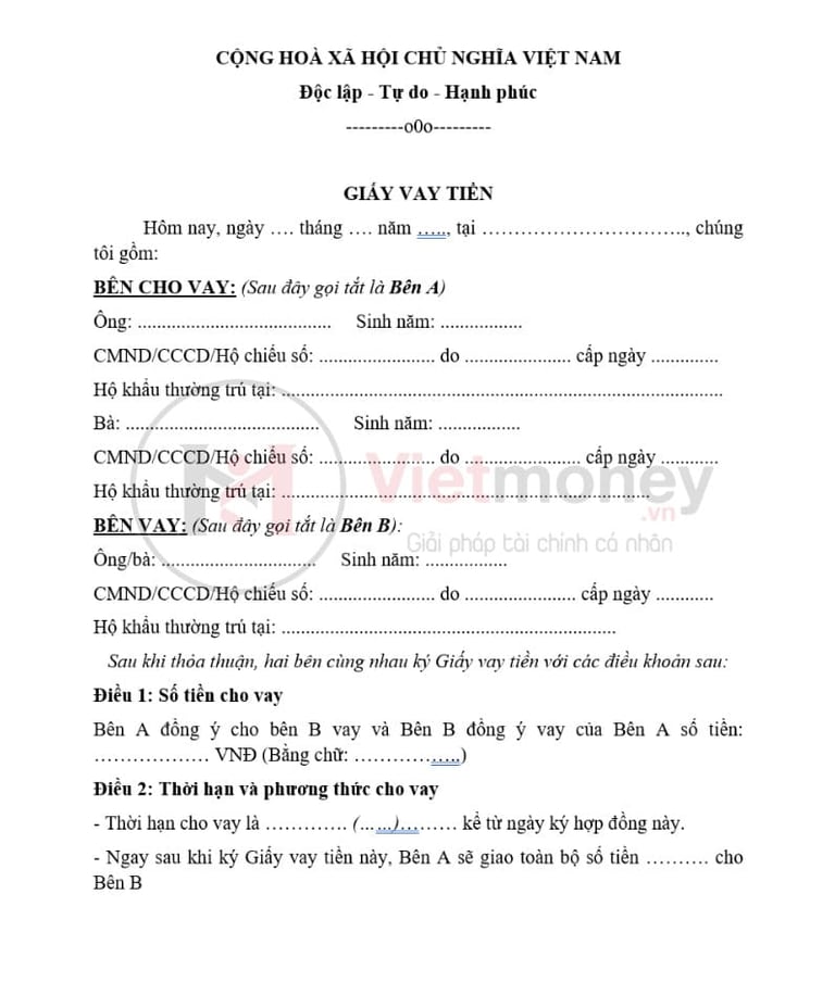 Giấy vay tiền, giấy mượn tiền là hai loại giấy tờ phổ biến khi phát sinh thỏa thuận giao dịch vay mượn giữa các bên. Các loại giấy tờ này ghi nhận thỏa thuận và giúp bảo vệ quyền lợi của cả hai bên trong quá trình giao dịch. Cùng VietMoney tham khảo mẫu giấy vay tiền, giấy mượn tiền cũng như những lưu ý quan trọng khi lập các giấy tờ này nhé!