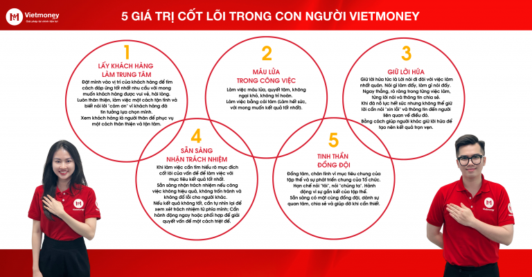 Đúc kết những bài học, nguyên lý tạo nên thành công và bản sắc của VietMoney trong suốt hơn 06 năm vừa qua, gói gọn trong 05 giá trị cốt lõi tạo nên con người VietMoney của hôm nay đó là: